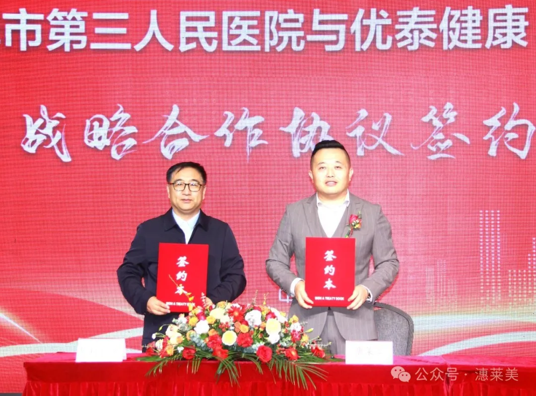 签约环节,菏泽市第三人民医院与优泰健康、潓莱美品牌进行签约并合影留念。