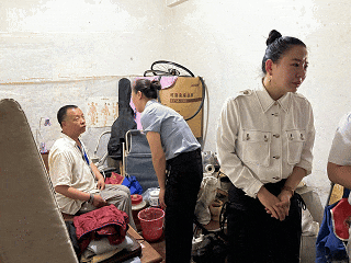 紧接着他们又带着物资来到了另外一位脑出血患者胡先生的家里,推开斑驳的铁门,狭小昏暗的房间里,消毒水的气味混着陈旧的霉味扑面而来。一场突如其来的脑出血,让胡先生失去意识、全身插管,只能依靠流食维持生命;雪上加霜的是,他的儿子本就耳背、视力模糊,连最基本的沟通都成难题。